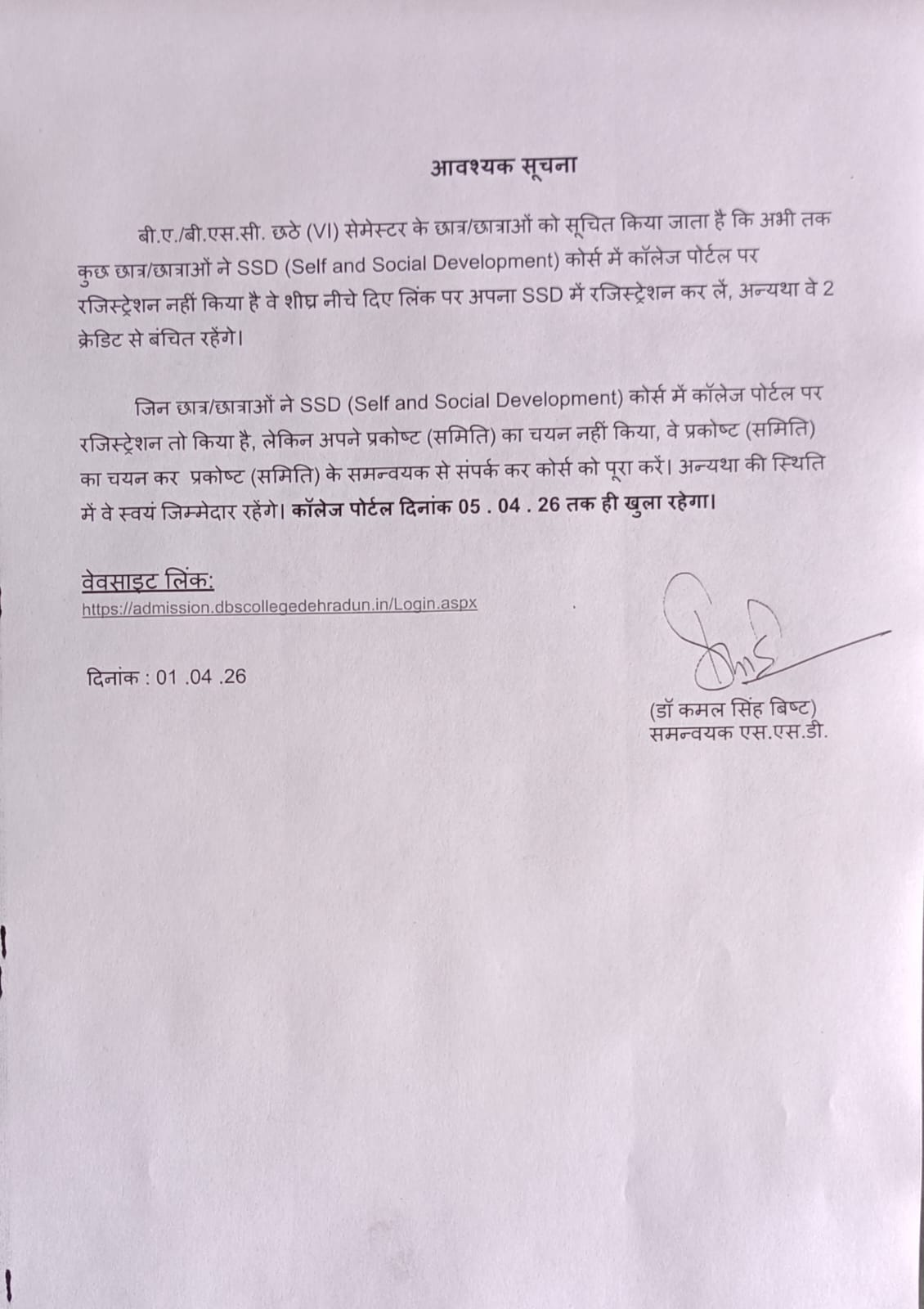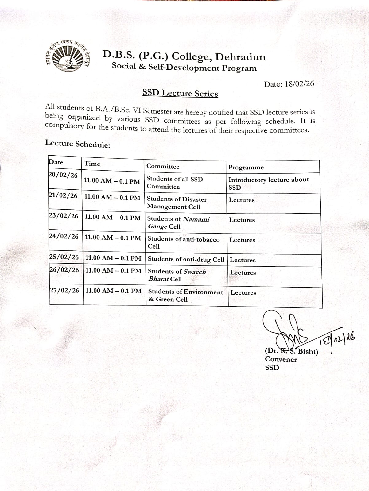I warmly welcome you to D.B.S. (P.G.) College, Dehradun, an institution with a proud legacy of more than six decades. With fourteen academic departments offering undergraduate, postgraduate, doctoral, and post-doctoral programmes, the college continues to uphold its reputation as a leading centre of higher education. It is a Uttarakhand State Government–aided institution affiliated with HNB Garhwal (Central) University), Srinagar.