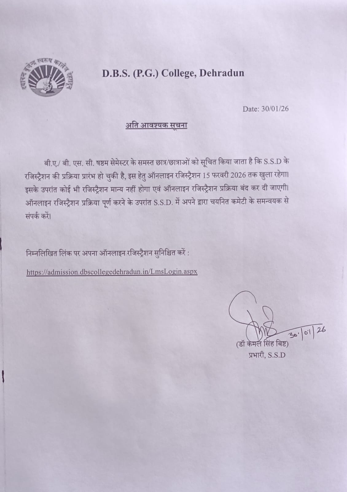 I warmly welcome you to D.B.S. (P.G.) College, Dehradun, an institution with a proud legacy of more than six decades. With fourteen academic departments offering undergraduate, postgraduate, doctoral, and post-doctoral programmes, the college continues to uphold its reputation as a leading centre of higher education. It is a Uttarakhand State Government–aided institution affiliated with HNB Garhwal (Central) University), Srinagar.
