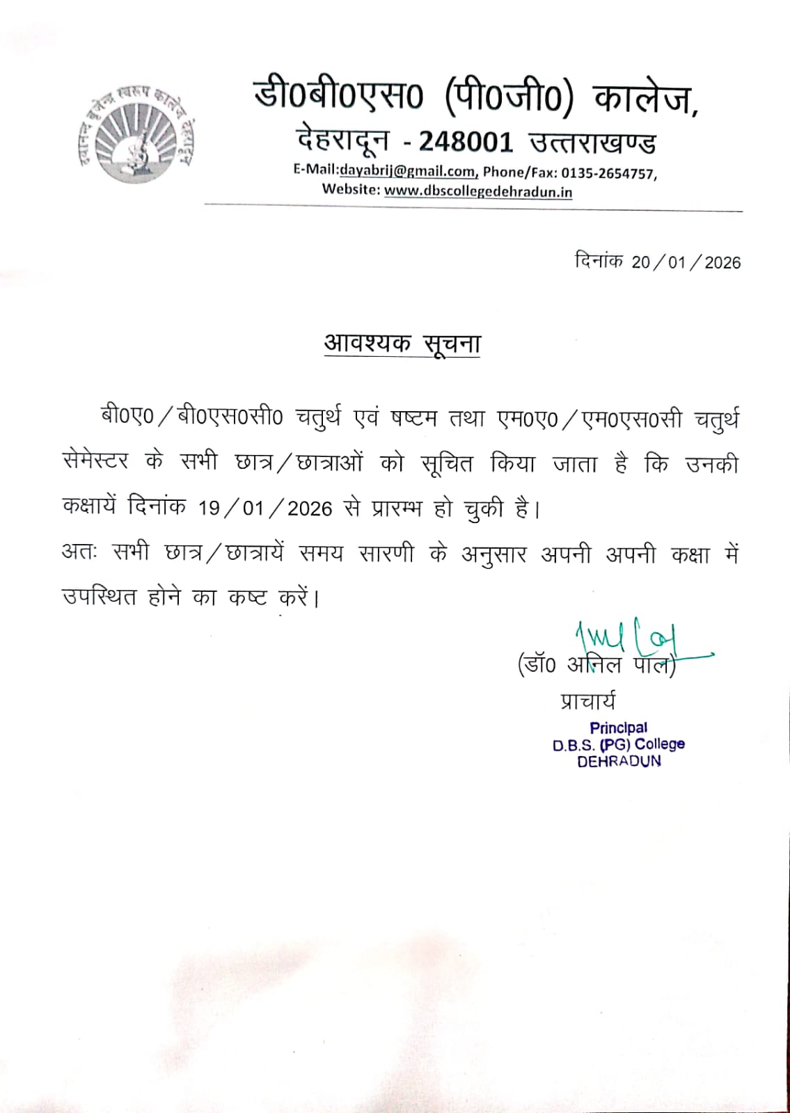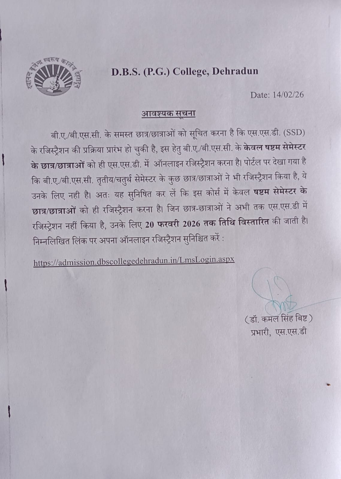 I warmly welcome you to D.B.S. (P.G.) College, Dehradun, an institution with a proud legacy of more than six decades. With fourteen academic departments offering undergraduate, postgraduate, doctoral, and post-doctoral programmes, the college continues to uphold its reputation as a leading centre of higher education. It is a Uttarakhand State Government–aided institution affiliated with HNB Garhwal (Central) University), Srinagar.
